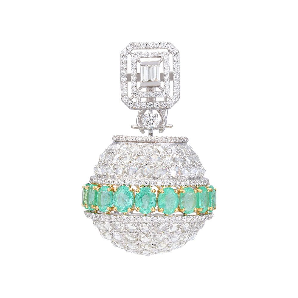 Radiate timeless elegance with the Emerald Flux Briolette Drops. A row of vivid oval emeralds encircles a lavishly diamond-studded sphere, seamlessly blending vibrant green with brilliant white. Above, a captivating design featuring round diamonds adds to the piece’s regal allure. Perfect for making a sophisticated statement, these earrings celebrate luxury and fine craftsmanship.