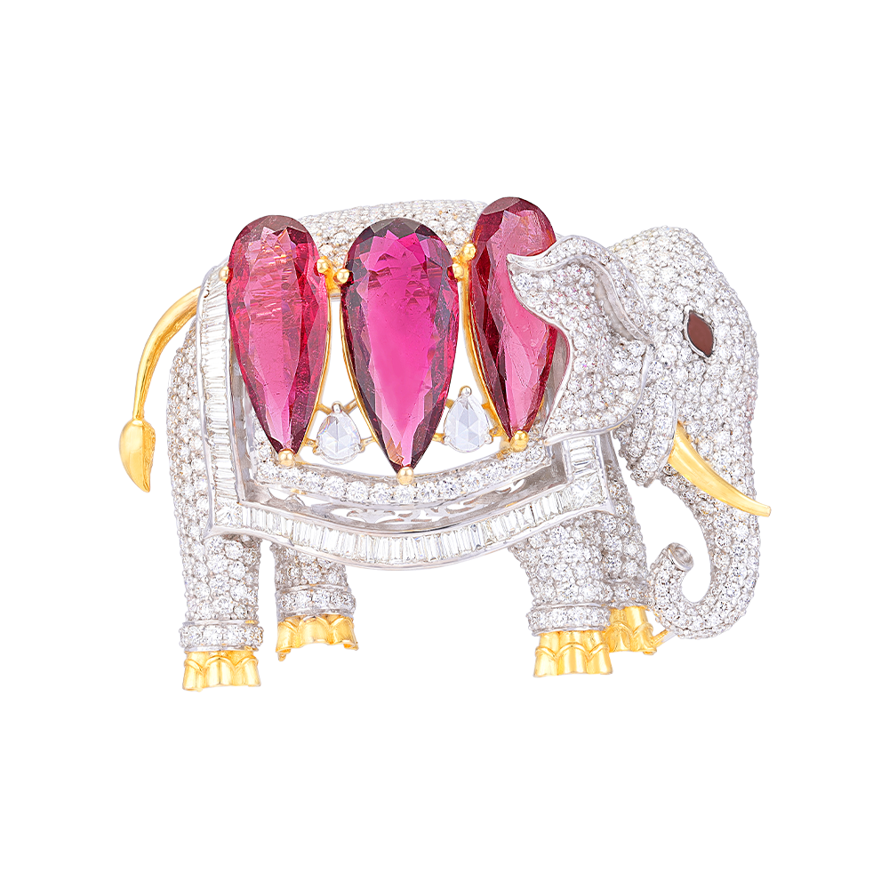 A striking tribute to elegance and tradition, the Ruby Regal Tusk Coat Pin features a majestic elephant adorned with dazzling pink tourmaline drops. Each tourmaline gemstone captures the light with a vivid, fiery hue, evoking a sense of regal grandeur. The intricately detailed design is encrusted with brilliant diamonds, creating a captivating interplay of sparkle and color. Finished with delicate gold accents on the tusks, tail, and feet, this coat pin is a true masterpiece—perfect for adding a touch of opulence to any attire.