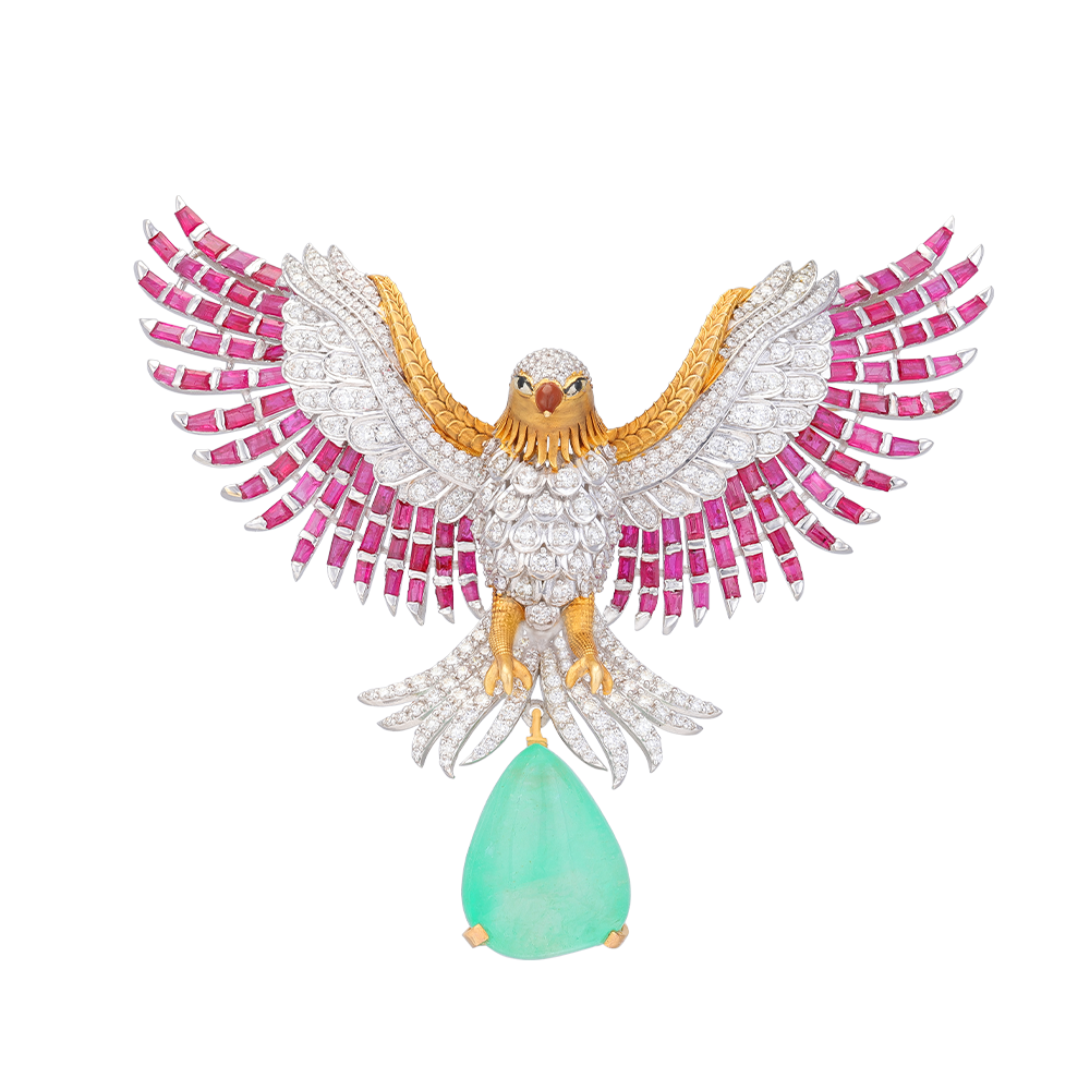A masterpiece of artistry and elegance, the Verde Mirage Eagle Brooch showcases a majestic eagle in flight, its wings adorned with a vibrant arrangement of ruby baguette stones and dazzling pear-cut emeralds. The intricate diamond accents add a touch of brilliance, highlighting the eagle’s powerful form. At the heart of this captivating piece, a lush green drop stone dangles gracefully, echoing nature’s allure and adding a dynamic element to the design. Perfect for making a bold, unforgettable statement, this brooch embodies strength, beauty, and impeccable craftsmanship.