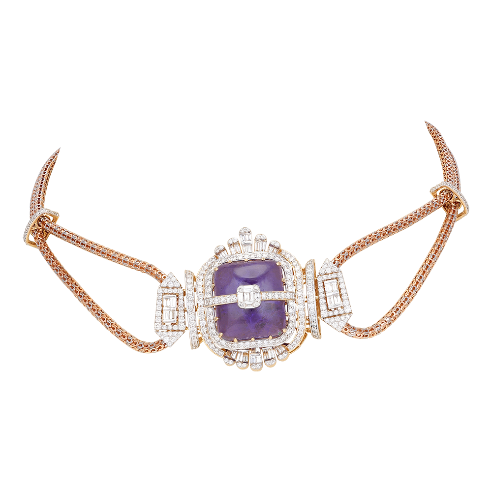 A symphony of elegance and grandeur, the Violet Zenith Luxe Necklace showcases a captivating cushion-cut amethyst center, radiating a rich, regal purple hue. Framed by a meticulously crafted arrangement of baguette and brilliant-cut diamonds, the centerpiece exudes timeless sophistication and brilliance. The intricately designed chain complements the central motif with a delicate yet striking look, creating an unforgettable statement piece that blends classic charm with contemporary artistry. Perfect for elevating any ensemble, this necklace is a celebration of refined luxury and impeccable craftsmanship.