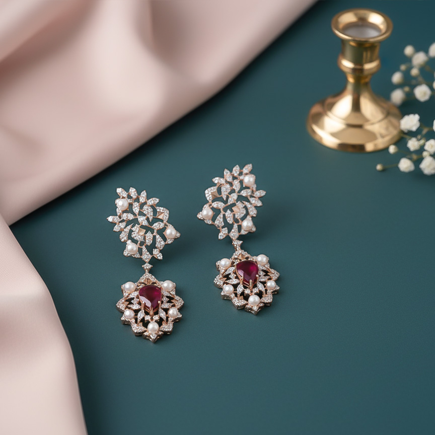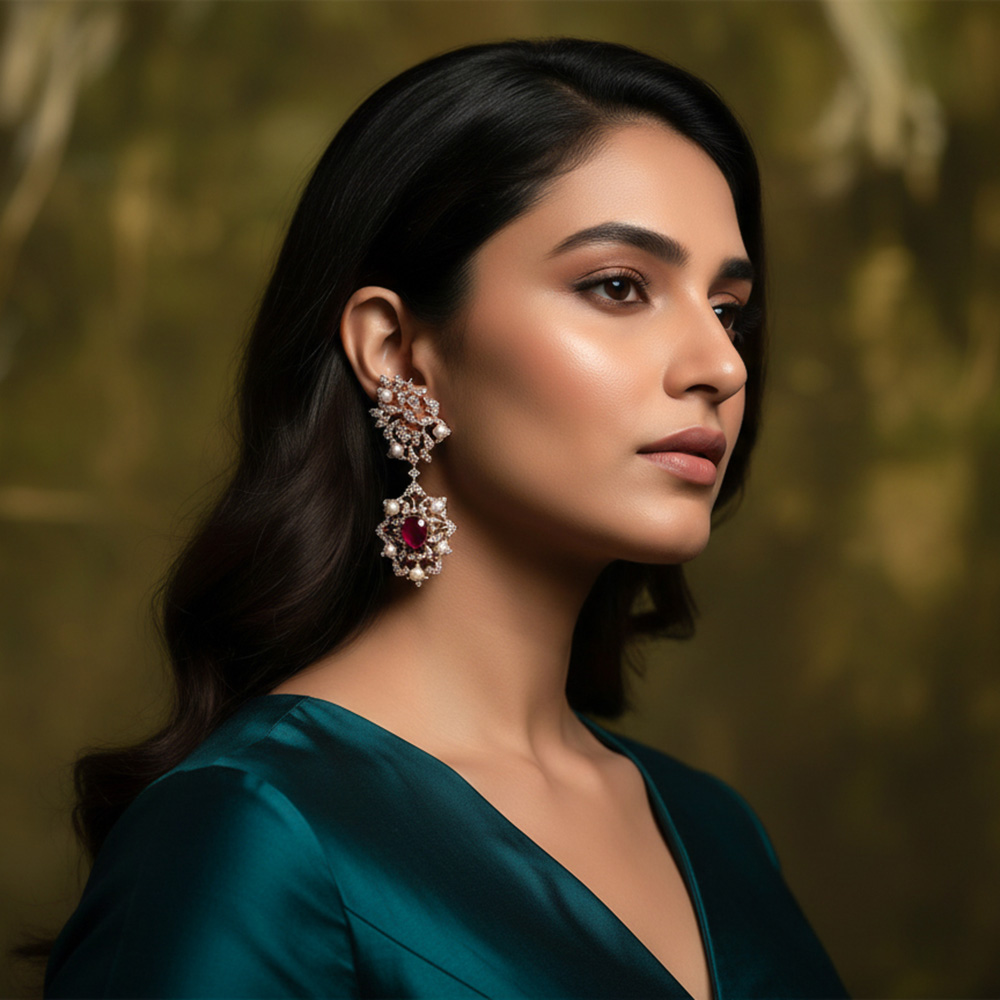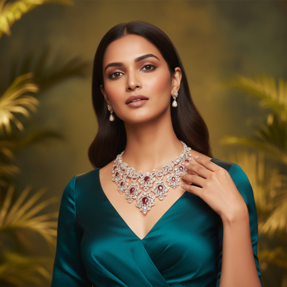 The combination of warm ruby tones and sparkling diamonds creates a dramatic yet refined statement — one that celebrates both tradition and individuality. Every piece in this ruby jewellery set tells a story of grace and grandeur, making it perfect for a woman who desires a look as rare as her spirit.