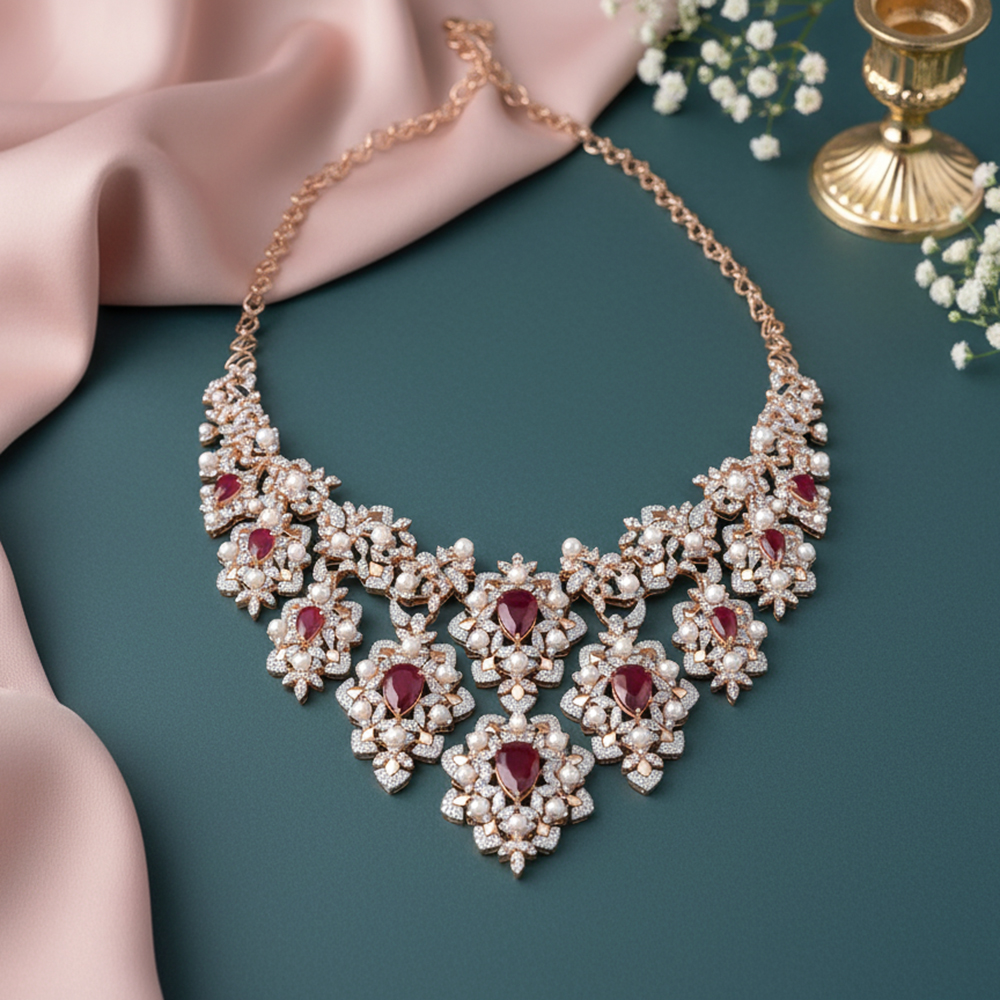 A bride’s jewellery should mirror her inner glow, and this diamond necklace set bridal piece does just that. It embodies romance and refinement, making it an exquisite diamond set for bride collection. The rubies add a regal contrast to the diamonds, while the rose gold foundation lends a soft, modern touch.
